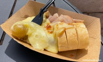 2020 epcot food and wine festival the alps Warm Raclette Swiss Cheese with Alpine Ham, Baby Potatoes, Cornichons and Baguette 3 By Traci C Leave a Comment