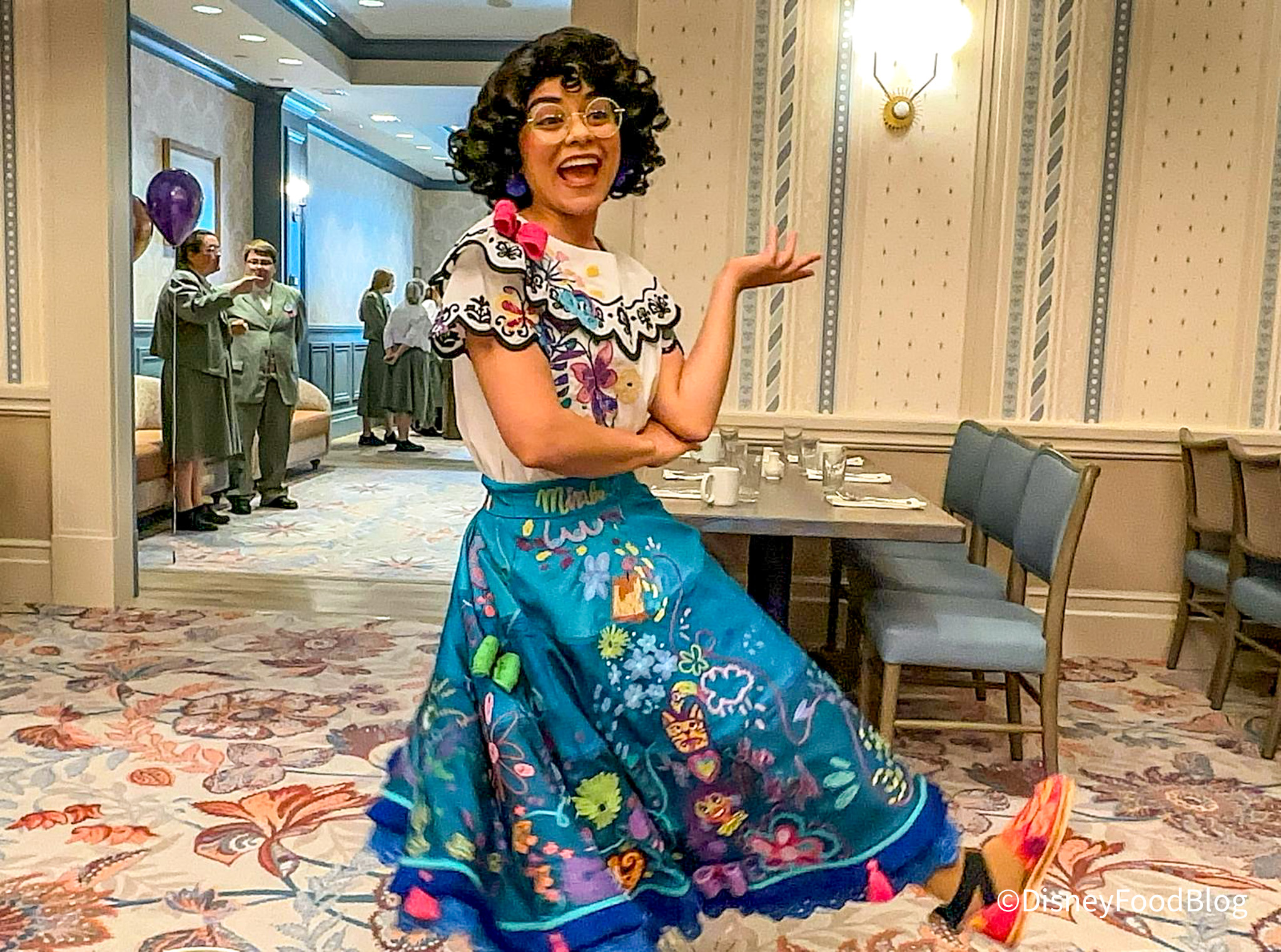Characters at this recently refreshed dining experience include Aladdin (in his Prince Ali look), Cinderella, Mirabel from Encanto, and Tiana in her new outfit for Tiana’s Bayou Adventure. They are all present to “celebrate the power of a wish” at Wish Makers Enchanted Dining!