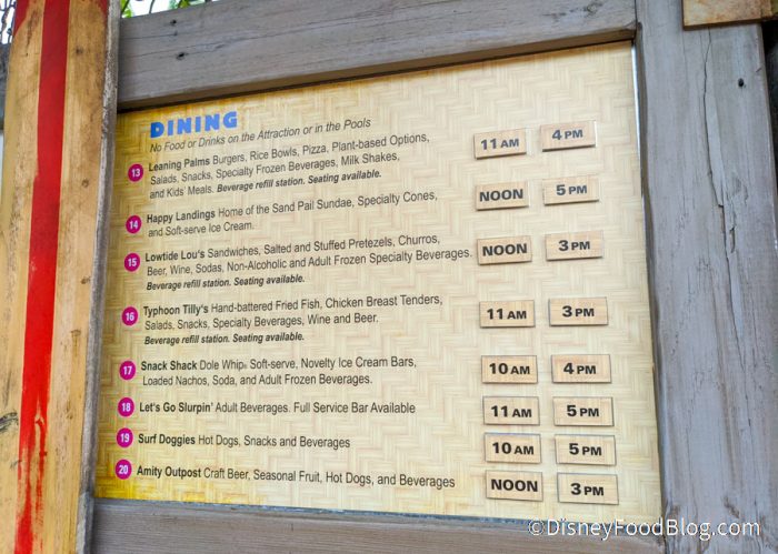 Though you’ll also find snacks available at the locations below, these are your best bets for full quick service meals when you really work up a hunger from all that swimming!