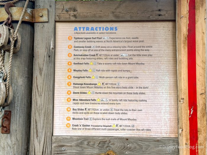 You’ll discover the story behind Typhoon Lagoon presented in a series of signs as you drive (or ride, by Disney bus transportation) towards the parking lot and bus stops: “A furious storm once roared ‘cross the sea, catching ships in its path, helpless to flee. Instead of a certain and watery doom, the winds swept them here to Typhoon Lagoon.”