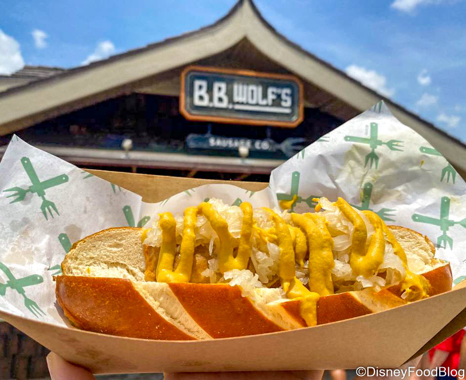 In Disney Springs, B.B. Wolf’s Sausage Co. offers a tasty Plant-Based Bratwurst Sausage. It comes with Sauerkraut and German Mustard on a Pretzel Roll served with a side of chips.