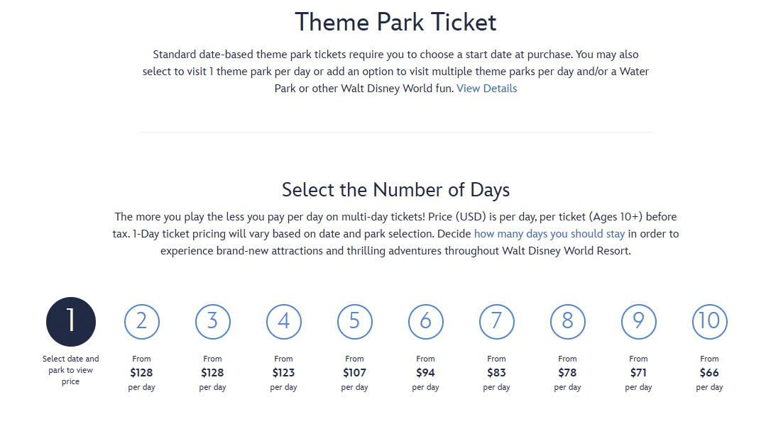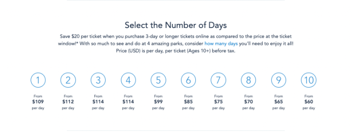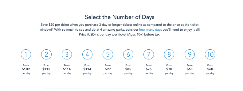 As with the Park Hopper, that added cost per day will decrease if you are buying tickets for a longer period of time. And again, the cost of your ticket will depend on the exact dates you choose to visit.