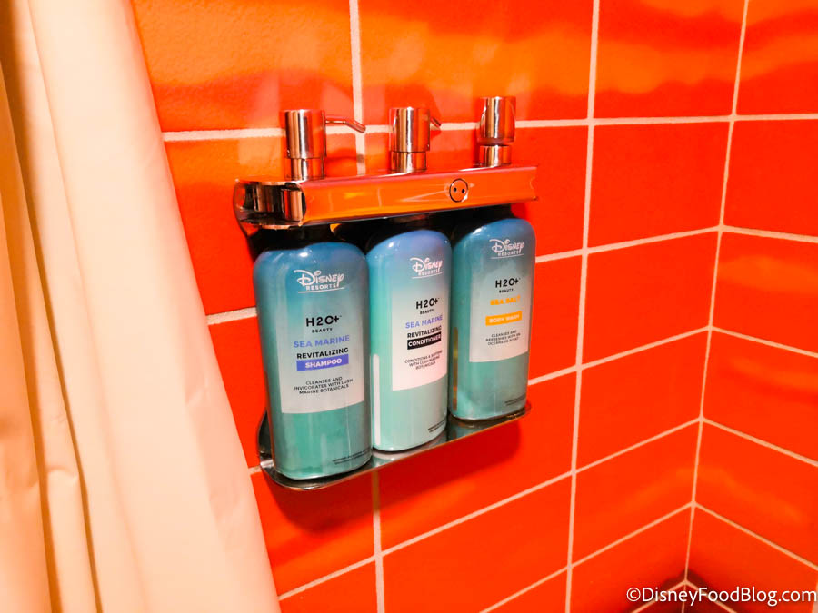 Inside the showers is a selection of Disney’s shampoo, conditioner, and body wash. These are refillable, reusable bottles.