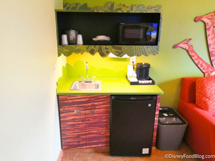 A closeup of the Kitchenette shows the mini refrigerator, a sink, a coffeemaker, and a microwave.