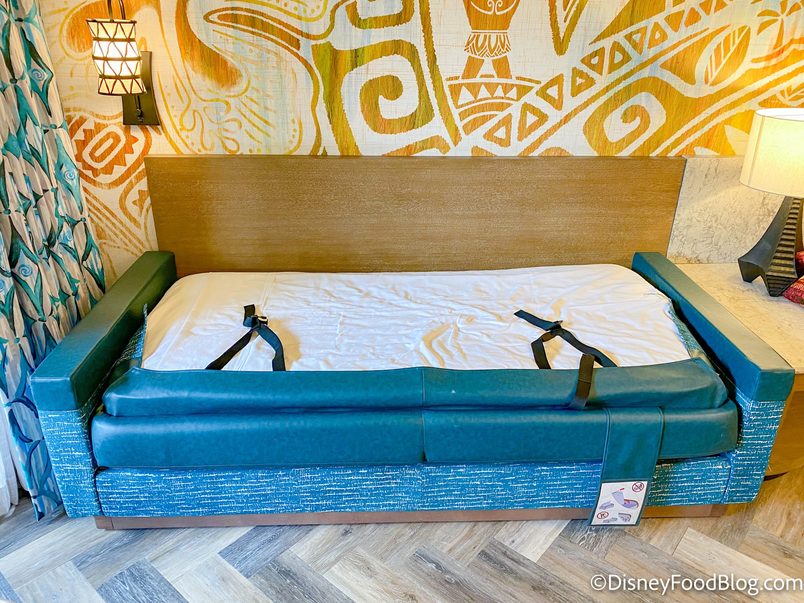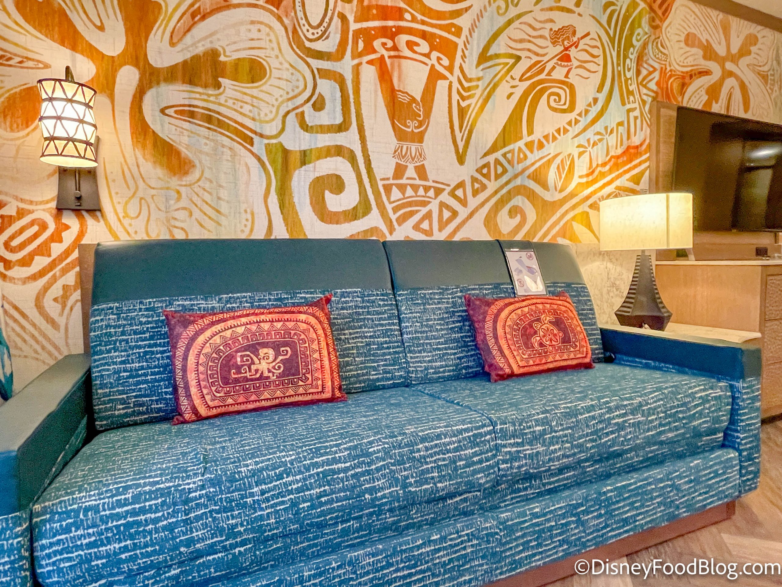 The couch has Moana-inspired cushions, plus it comes with a handy tag showing instructions on how to convert it into a bed.