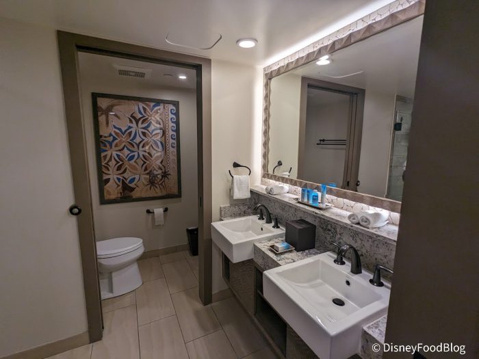Over in the bathroom, you have plenty of room to get ready for a full day in the parks. There are two sinks, a large shower, and a separate toilet room.