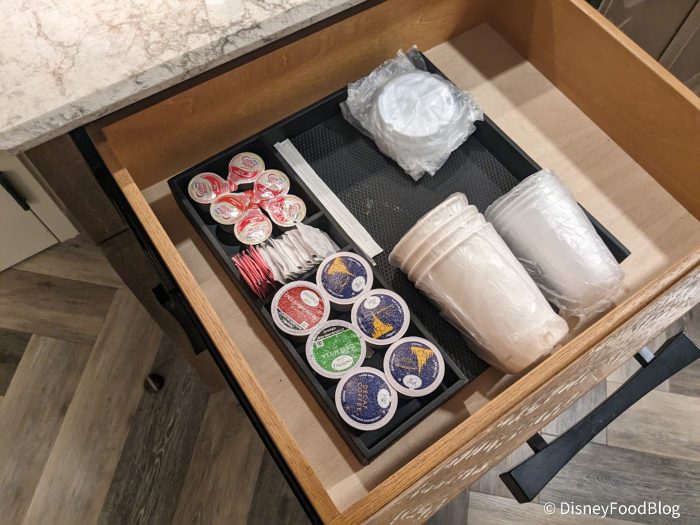 The coffee bar is supplied with a Keurig and all you need for a nice cup of joe in the morning.
