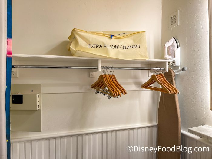 On the opposite side of the shower is the room’s closet, which features an iron and ironing board, hangers, waste bins, and an extra pillow and blanket.