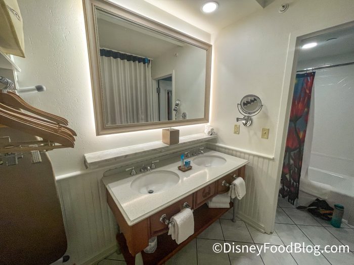 Heading to the bathroom, you’ll notice that there isn’t technically a door to the sink area of the bathroom (which is fairly common in Disney Resort rooms). Instead, a curtain with bright artwork featuring Princess Tiana provides a divide.