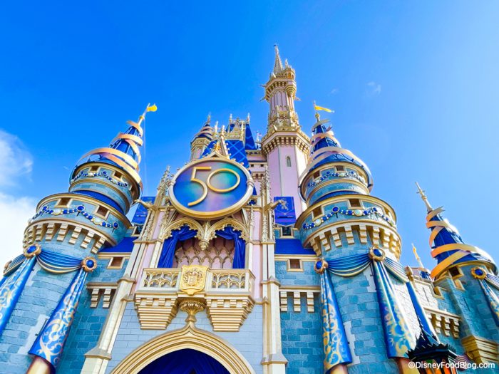 Magic Kingdom’s iconic Cinderella Castle has been further enhanced with gold bunting, banners, and a gorgeous 50th Anniversary crest.