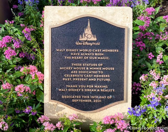 Past, present, and future cast members are also honored with a plaque in the hub in front of Cinderella Castle tucked between the golden character statues of Mickey and Minnie.